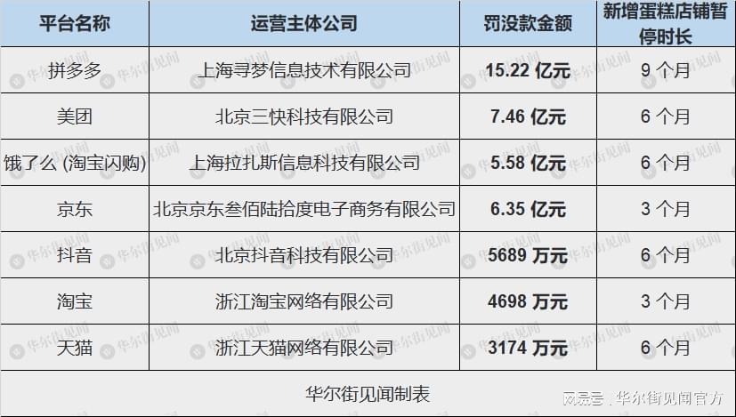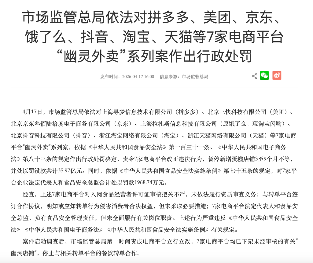 据央视新闻报道,4月17日,市场监管总局依法对上海寻梦信息技术有限公司()、北京三快科技有限公司(美团)、北京京东叁佰陆拾度电子商务有限公司(京东)、上海拉扎斯信息科技有限公司(原饿了么,现淘宝闪购)、北京抖音科技有限公司(抖音)、浙江淘宝网络有限公司(淘宝)、浙江天猫网络有限公司(天猫)等7家电商平台“幽灵外卖”系列案,依据《中华人民共和国食品安全法》第一百三十一条、《中华人民共和国电子商务法》第八十三条的规定作出行政处罚决定,责令7家电商平台改正违法行为,暂停新增蛋糕店铺3至9个月不等,并处以罚没款共计35.97亿元。同时,依据《中华人民共和国食品安全法实施条例》第七十五条的规定,对7家平台企业法定代表人和食品安全总监合计处以罚款1968.74万元。