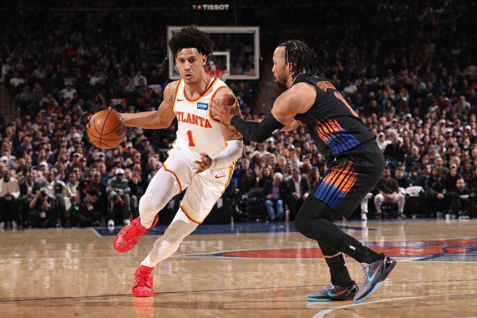 中场休息回来,尼克斯率先一波8-2攻势扩大13分优势,老鹰连追4分,尼克斯多点开花扩大80-66领先。布伦森攻传结合维持84-71领先,老鹰一波6-0攻势追分,唐斯上篮与三分连得5分,麦科勒姆与阿尔瓦拉多对喷各吃一T。库明加两罚全中,罗宾逊暴扣,双方随后接连打铁。尼克斯单节30-25净胜5分,三节结束尼克斯91-79领先老鹰,前三节比赛尼克斯三分23中8,布伦森19分7助攻与唐斯18+8,引领6人得分上双;老鹰三分27中8,麦科勒姆26分5助攻与杰伦11+6,引领4人得分上双。